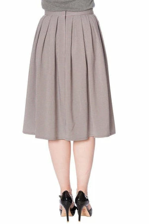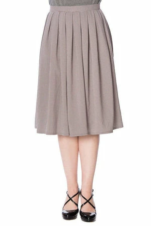 The flared skirt has a checkered print, pleats detail, side seam pockets, a figure accentuating shape and it fastens at the back with a zipper.