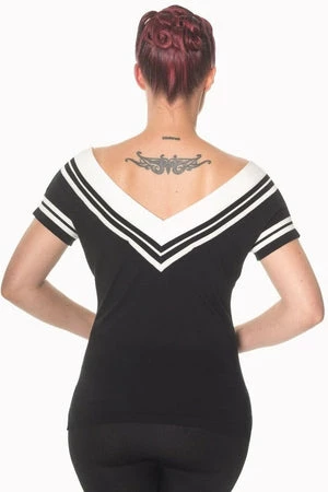 This is an appealing, vintage, ladies short sleeve top style by Banned, the “cedar top”, available in black with white details around the V-neckline and cuffs, or the reverse in white with black details.
