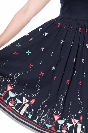 The dress has Christmas and cocktail themed print, front keyhole cut out and button detail, short sleeves, pleats detailing, a flattering fit and it fastens at the back with a zipper.
