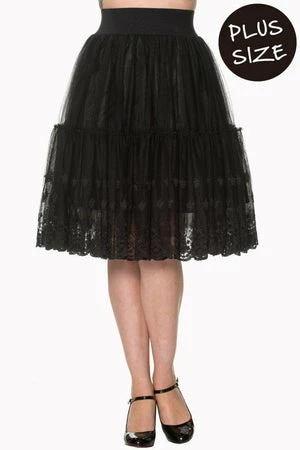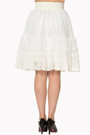 A superb, rockabilly, ladies skirt style made by Banned Apparel, the “first sight skirt”, with a waistband and net overlay, available in black or off-white colours.