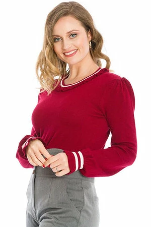 The style has contrast neckline and sleeves, ribbed cuffs and hem, crew neckline, long sleeves and a figure accentuating shape.