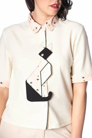 The blouse has cat design, a high neckline, short sleeves, a figure accentuating shape and if fastens with buttons at the front.
