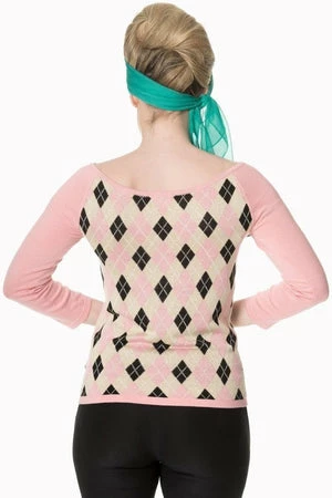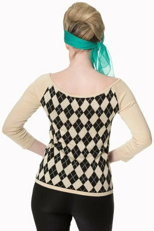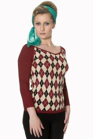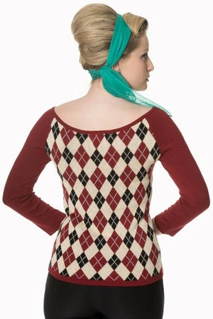 Check out this outstanding, rockabilly, ladies sweater design from Banned Apparel, the “great heights off shoulder knit top”, with an appealing diamonds design, available in various colours.