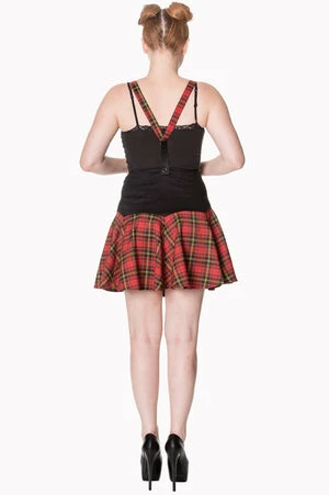 The mini skirt has tartan themed design, detachable strap detailing, a waist accentuating shape and it fastens with a zipper at the front.