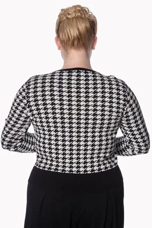 The black and white knitted cardigan has a stunning bold dogtooth pattern, a round neckline, collar bow detailing, ribbed hem and cuffs, full length sleeves and fastens at the front with matching glossy buttons.