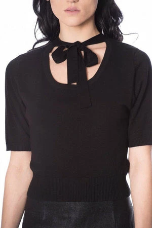 The top has a bat design on the back, a U-neckline, short sleeves, ribbon neck tie detail and a figure accentuating fit.