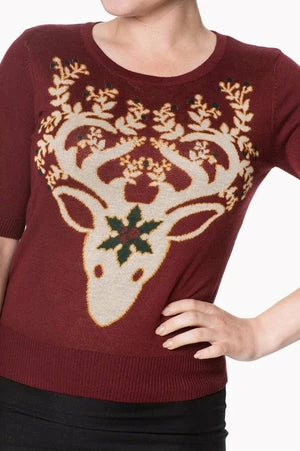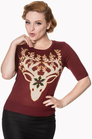 The vintage top has reindeer print, a crew neckline, short sleeves, ribbed hem and cuffs detailing and a figure accentuating fit.