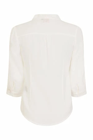 The blouse has a V-neckline with collars, a flattering fit and it fastens at the front with buttons.