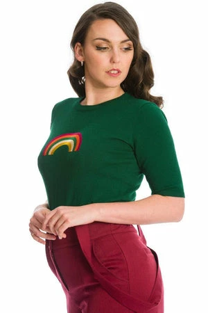 The retro style jumper has rainbow design, a crew neckline, half length sleeves and a figure accentuating fit.