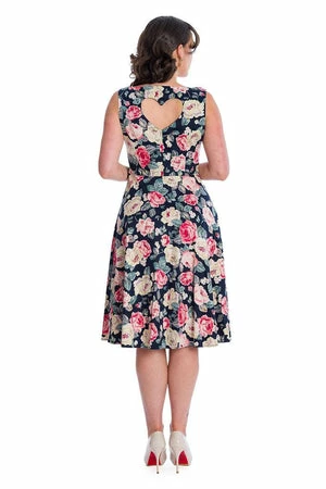 The sleeveless dress has allover Rose print, a round neckline, pockets, back heart cut-out detail, a flared skirt and it fastens at the back with buttons.