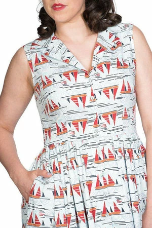 The sleeveless dress has all over sail border print, V-neckline, pleats detail, side pockets, a figure accentuating shape and it fastens at the front with buttons.