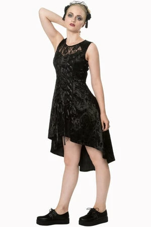 Goth it up in this epic dress by Banned, the skull candy dress. This style is sleeveless in black with a skeleton cameos, crosses and flowers print and has corset style ribbon details at the front and a roses lace panel at the neckline.