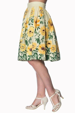The vintage skirt has a sunflower themed print, a figure accentuating shape and it fastens at the back with a zipper.