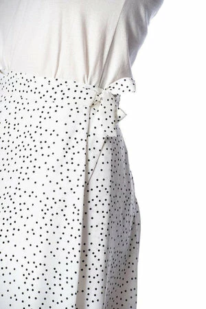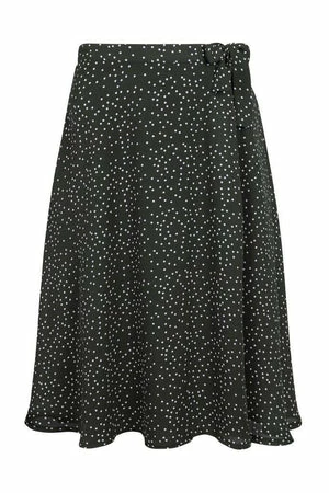 The vintage skirt has a sweet spots print a figure accentuating shape and it fastens with a ribbon tie at the side.