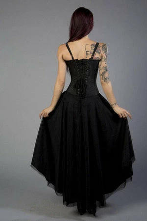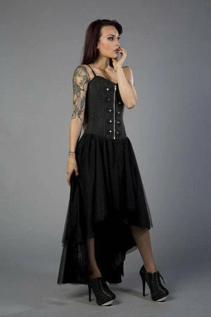 This Gypsy Victorian gothic corset dress has taffeta detailing, mesh skirt with front zip and military style silver buttons and back lace fastening with modesty panel.