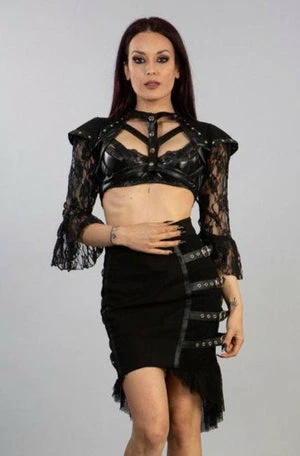 This Ines steampunk black twill and black matte vinyl bolero shrug has black lace three quarter sleeves, black matt buckles, silver studs details and a flattering fit.