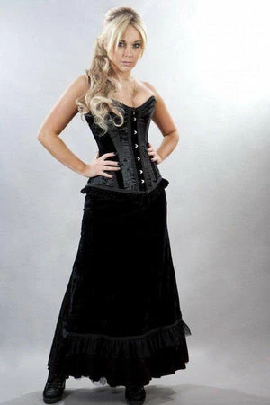 This Morgana long gothic victorian, satin skirt has black floral flock, black flock velvet panel with pockets, rear laced satin ribbon detail, a flattering fit and it fastens with a side zipper.