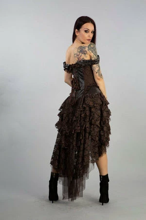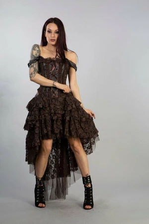 This Ophelie burlesque coffee brown matte corset dresshas brown lace detail, lace frills and ribbon detail, back lace fastening with modesty panel.