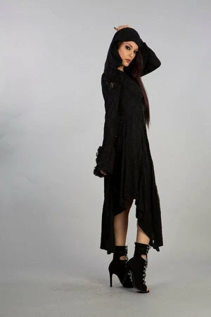 This Pentagram cotton and black lace overlay, maxi dress has a long hood, cut-out detail, flared sleeves, front slinky split, a flattering fit and it fastens with zipper at the front.