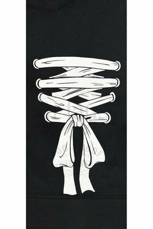 The black cotton hoodie has corset bow design, high neckline, long sleeves, a regular fit and it fastens with a zipper at the front.