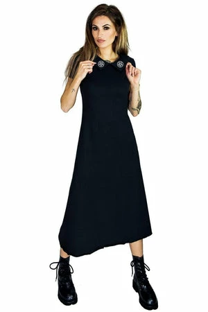 The jersey mix, black long dress has pentagram print on the collar, choker and strap short sleeves and a figure accentuating shape.