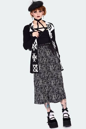 This knitted cardigan has magical symbols design, contrast inner panel detail, full length sleeves and an open front.