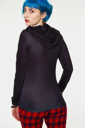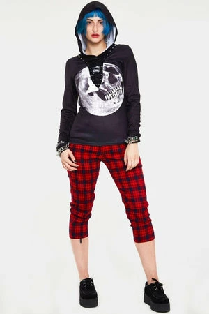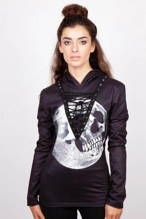 This is a cute and comfortable black Gothic pullover hoodie from Jawbreaker with a touch of death. The style features a supernatural kull in the Moon themed print, full length sleeves and lace up collar.