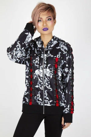 The style has an epic smoke and skull design, back hood, full length sleeves with ribbed cuffs, pockets, laced panels embellishment and it fastens with a zipper at the front.