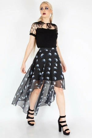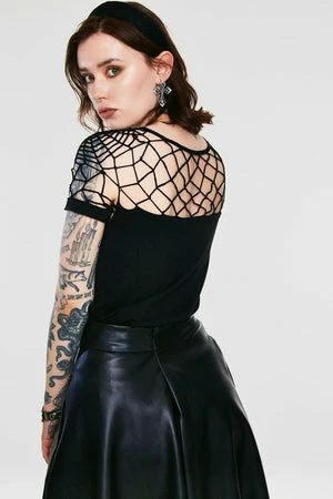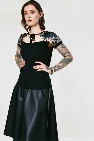 This spooky knitted top has spiderweb embroidery, neck tie, web sleeve, shoulder detail and a flattering fit.