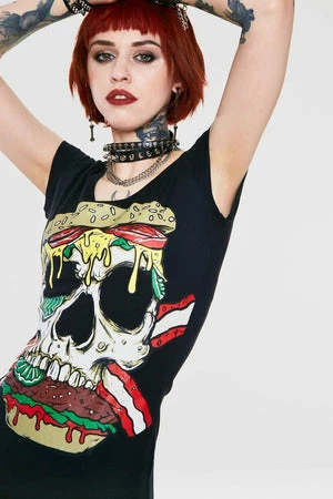 A morbidly funny printed t-shirt from Jawbreaker, with a zombie burger design of a skull in a burger with cheese, bacon and pickles dripping over the forehead and down the eye-sockets, looks delicious!
