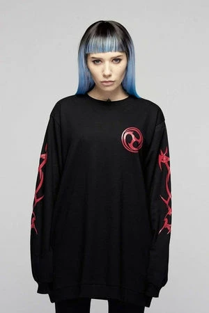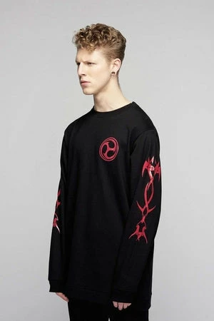 This is an epic, tribal style gothic sweater in black from Long Clothing. This sweatshirt features red tribal details on the arms, a tribal logo on the front and is completed with side pockets.