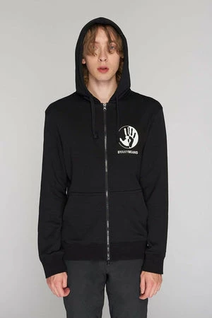 A formidable and comfortable, black unisex hoodie from long clothing, which zips up the front and has a black and white hand print with “BY ANY MEANS” caption.