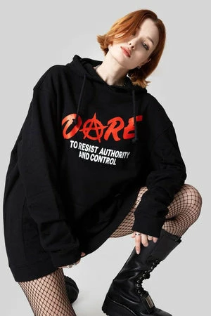 The oversized sweater has ‘Dare’ front print, front pockets, back hood, ribbon tie details and a regular fit.