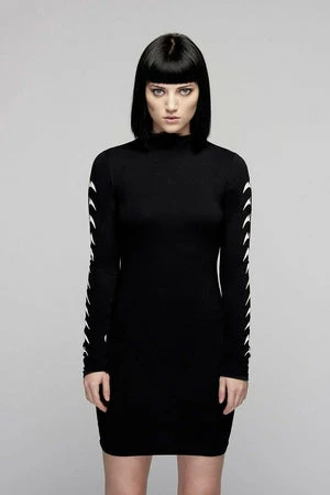Turn heads and look like a badder bitch in this, black, long sleeved bodycon dress from Long Clothing called Exo with a striking white spinal style tribal print on the arms and back.