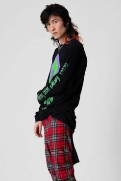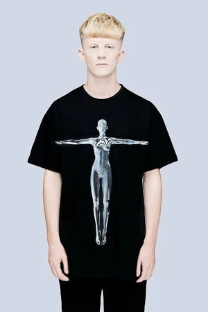 A slammin’ unisex short sleeve t-shirt style by Long Clothing, in black with white print. Designed in collaboration with Pussykrew and featuring a front print of a metallic style flying virtual female figure.