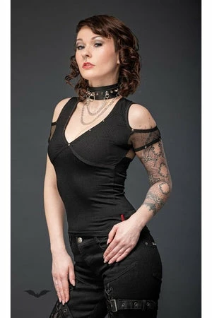 A wicked top for any goth, created by Queen of Darkness. This top has a v neck cut adorned with studs, with mesh covering part of the arms and half of the back.