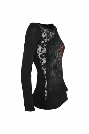 This tempting gothic top from Spiral Clothing, with burnt rose print and gorgeous lace detail is perfect for keeping your look edgy.