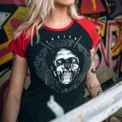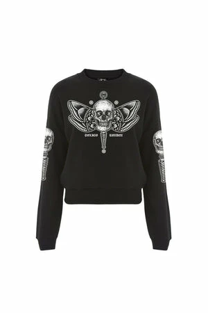 This ladies cropped sweatshirt has Toxico x Bad Bones tattoo, prints on front and sleeves, a high neckline, ribbed hem and cuffs.