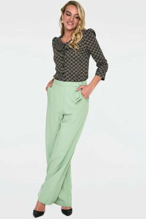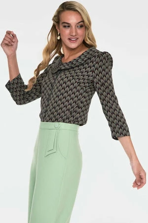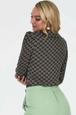 The vintage knitted blouse has art deco inspired print, a crew neckline. Peter Pan collars, three quarter length sleeves with cuffs and a flattering fit.