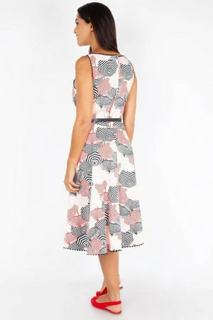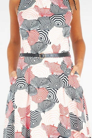 The midi dress has Parasole print, shift-style neckline, PU leather waist belt, a flattering fit and it fastens with a zipper at the back.