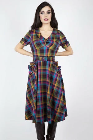 This flared dress has a multicolor plaid design, a V-neckline, bow and button detailing, ribbed hem and cuffs, a matching belt, a flattering fit and it fastens with a zipper at the back.