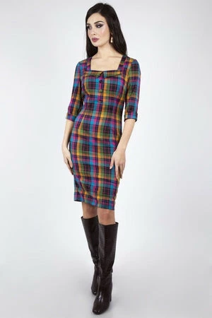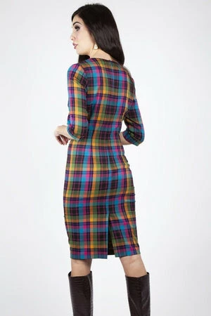 This pencil wiggle dress has a multicolor plaid design, a collared square neckline, button detailing, ribbed hem and cuffs, back slit, a flattering fit and it fastens with a zipper at the back.