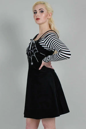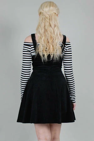 This overall corduroy dress has neckline white spider web embroidery, V-neckline, long sleeves, a flattering fit and it fastens with a zipper at the back.