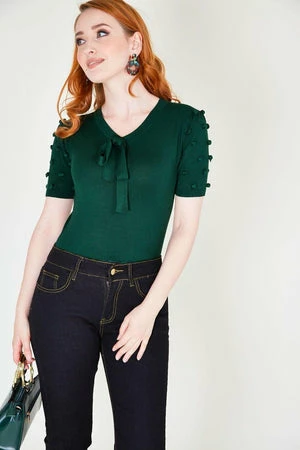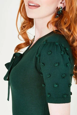 This soft, fine knit, slightly shorter style sweater has a v-neckline, fixed tie straps, short puffed sleeves with polka dots and stretchy ribbed trim.