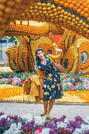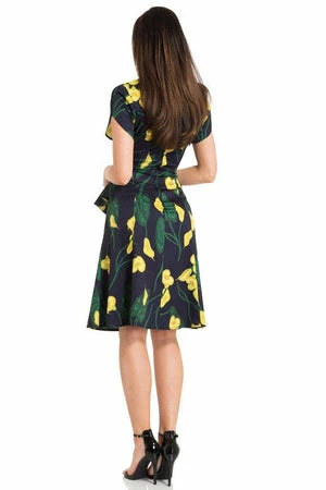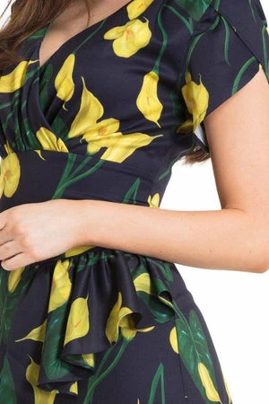 The navy midi dress has yellow lily print, ruffle on side on of waist, tulip sleeves, a figure accentuating shape and it fastens with an invisible at the back.