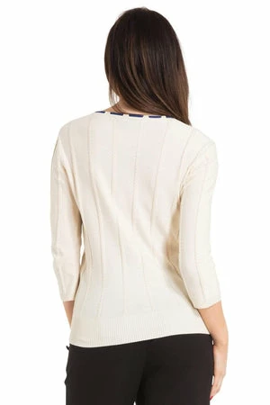 This gorgeous vintage sweater has a contrast blue drawstring style neck tie, ribbed hem and cuffs and three quarter length sleeves.