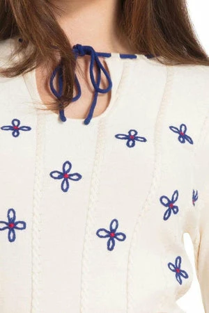 “Holly” a stylish and eye-catching retro, floral, cream colored knitted pull-over sweatshirt from Voodoo Vixen, with delicate blue flower prints.