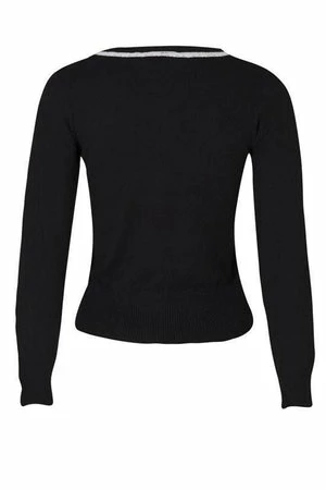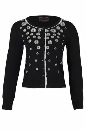 “Leticia” an amazing, black, vintage cardigan in plus sizes from Voodoo Vixen. This rockabilly style, soft knitted cardigan has a captivating white roses embroidery on the front a round neckline and black matching buttons.