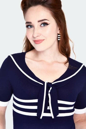 This exquisite rockabilly sweater from Voodoo Vixen, will keep you on trend and in style with a retro flair! The style is available in navy or white color.