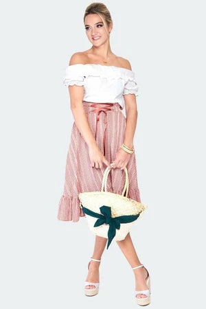 The vintage Milkmaid style blouse has a ruffle neckline, lace trim detailing, short sleeves and a flattering fit.